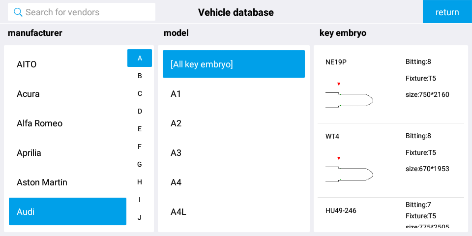 Comprehensive Key Database Includes full vehicle key database and key blank library, supports lost key search, tooth depth analysis, and customized key types.